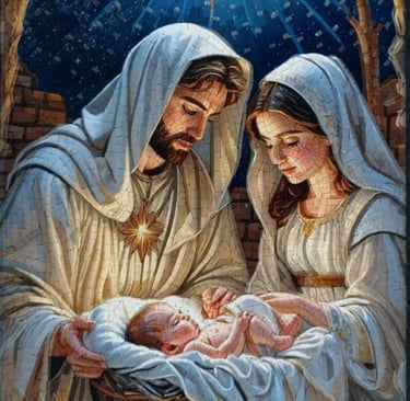 Each piece tells a story, carved from olivewood and adorned with mosaic stones from Jerusalem and Bethlehem.
